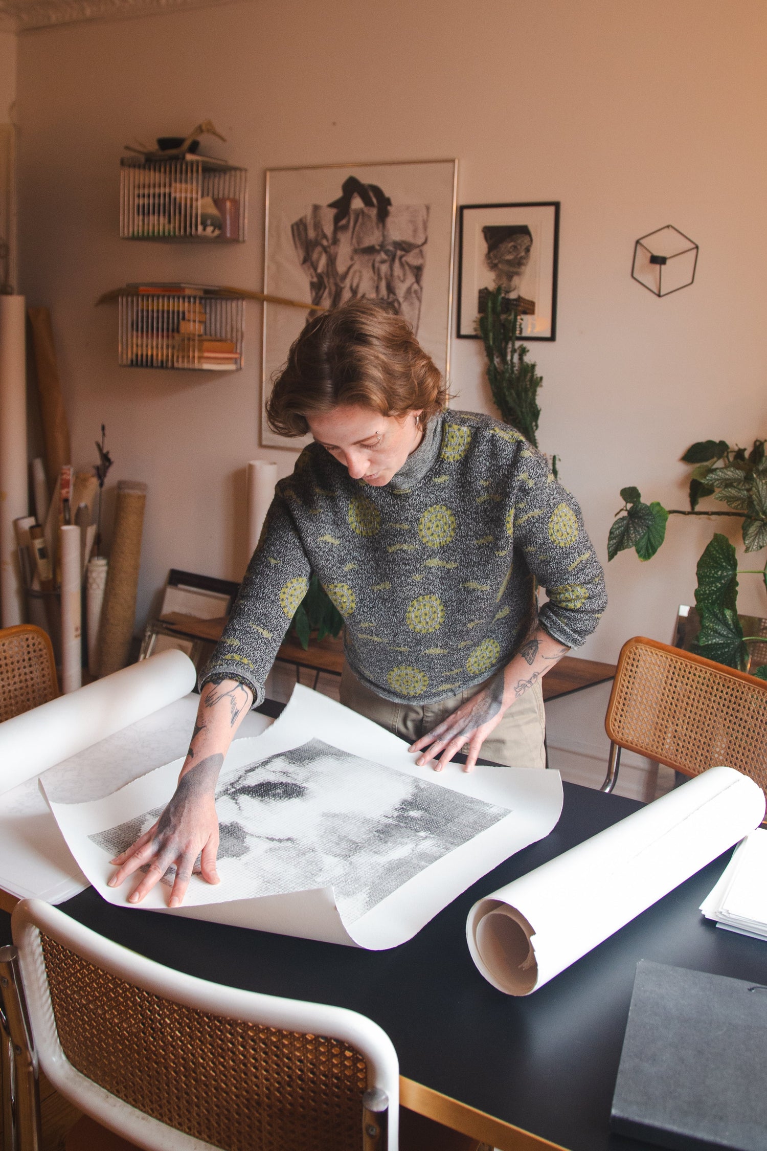 In the series of monotype prints, Julie takes her starting point in the squared mathematics notebook. Here, the grid functions as a set of rules for systematics and repetition, but the repetitions are used to open a freer, more dreamy space. The stringent pattern, etched into the copper plate, contrasts with the deep and soft colors of the applied printing ink, creating a tension between the tight and the lively.