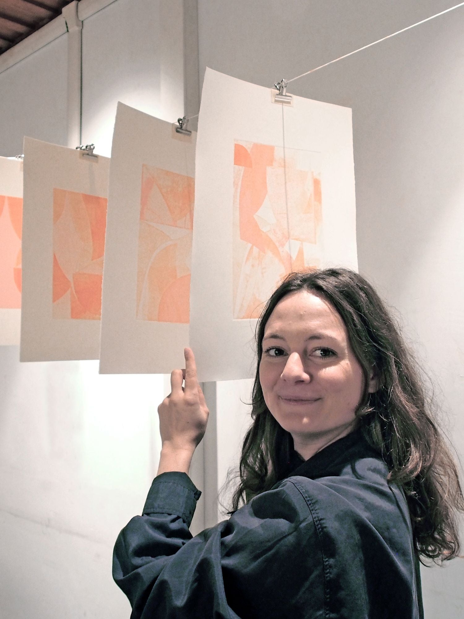 Simone Vestergaard's work is characterized by her fascination with craftsmanship, slowness, and imperfections. Through graphic techniques such as copper and linoleum printing, as well as methods like monotype printing, she creates works that combine tactility, geometry, and colors. Her works revolve around contrasts such as silence and dynamics, density and transparency, and organic versus strict form.