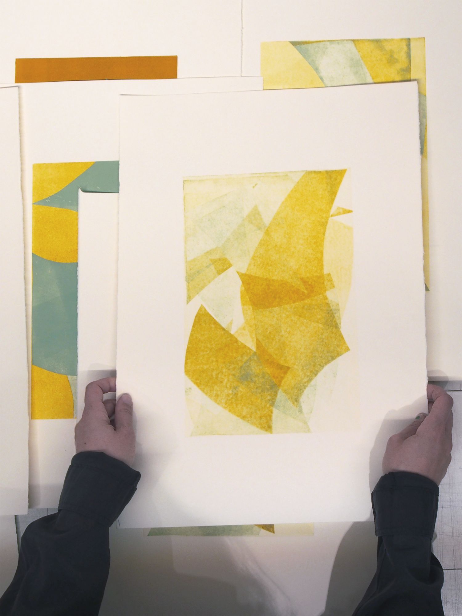 With a background in both art and architectural practice. Her creative process is both organic and intuitive, where each printing plate is repeatedly printed and overlaid with new colors and shapes. This process, where imperfections and surprises play a central role, gives each work a unique depth that reflects her passion for aesthetics and artistic reflection.