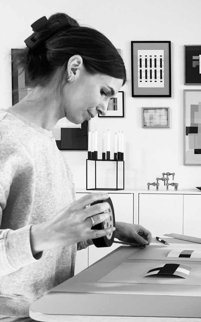 Louise's characteristic style with straight lines arose by accident when one day she began experimenting with painter's tape. It was the placement of the tape, not the paint, that created the most interesting patterns, and this intuitive working process quickly became a central part of her artistic expression. Louise also experiments with a range of materials such as paint, marker, fabric, and cardboard, which together create works with exciting three-dimensional depth. Her inspiration comes from the small patterns and structures she encounters in everyday life, from nature to everyday objects, which she transforms into art with a sense of calm and balance.