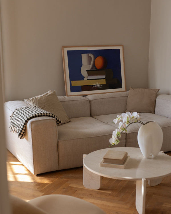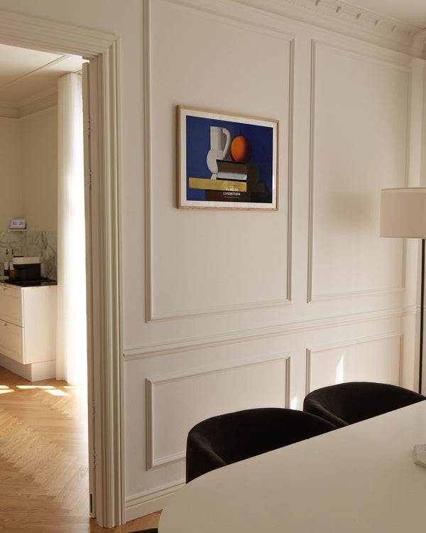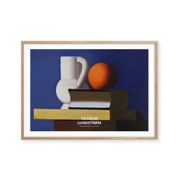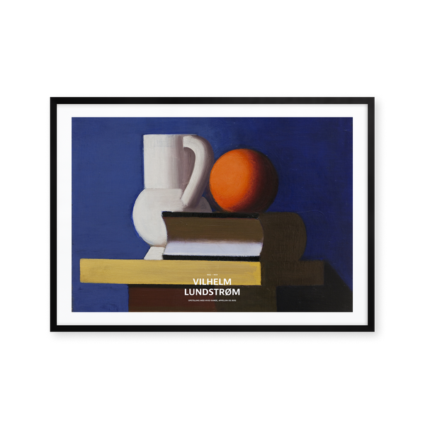 The art print: “Arrangement with white jug, orange, and book” by the artist Vilhelm Lundstrøm is a painted art print recreated by Peléton. This art prints series with Vilhelm Lundstrøm's experimental and geometric art prints is characterized by his colorful yet simple style. This art print is part of Peléton's vintage collection with museum layout. The art print is produced on quality paper, with long durability, high opacity, and detailed color reproduction.