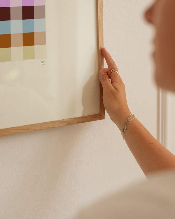 Our frames are made from high-quality materials and are available in solid oak, dark-stained oak, and black-painted pine. All frames come with real glass, while the largest sizes (70 × 100 cm and 100 × 140 cm) feature 2 mm acrylic glass, which looks like glass but is lighter and more shatter-resistant (durable).