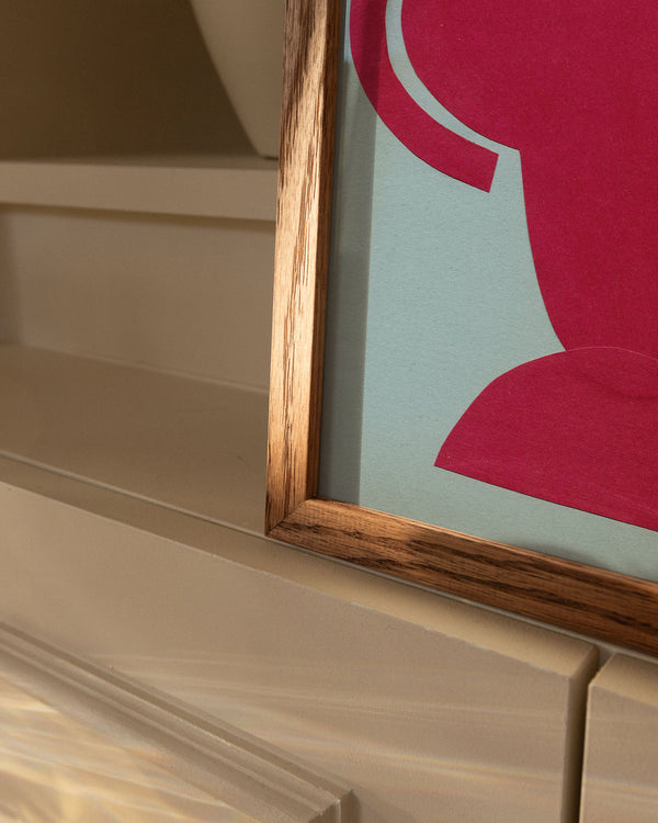 Our frames are made from high-quality materials and are available in solid oak, dark-stained oak, and black-painted pine. All frames come with real glass, while the largest sizes (70 × 100 cm and 100 × 140 cm) feature 2 mm acrylic glass, which looks like glass but is lighter and more shatter-resistant (durable).