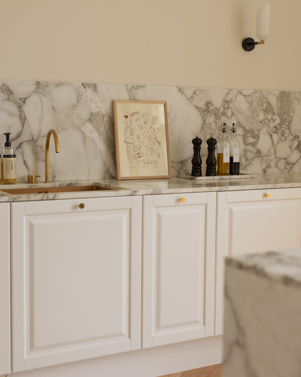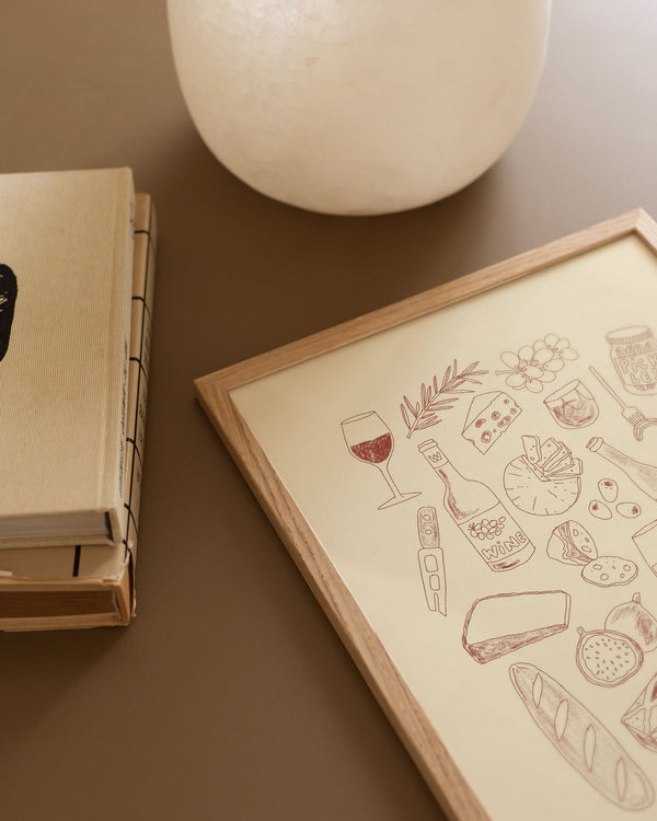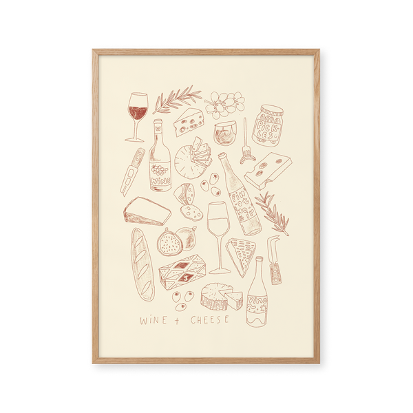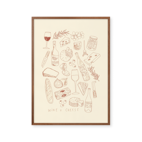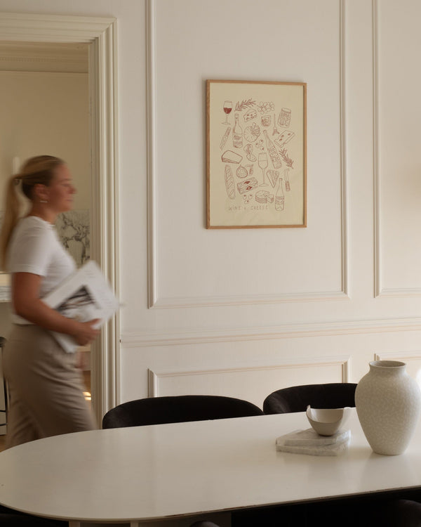 The art poster: “Cheese and Wine” by the artist Lauren Emmett is an illustrated poster curated by Peléton. It has been meaningful to her that the poster is open to interpretation.