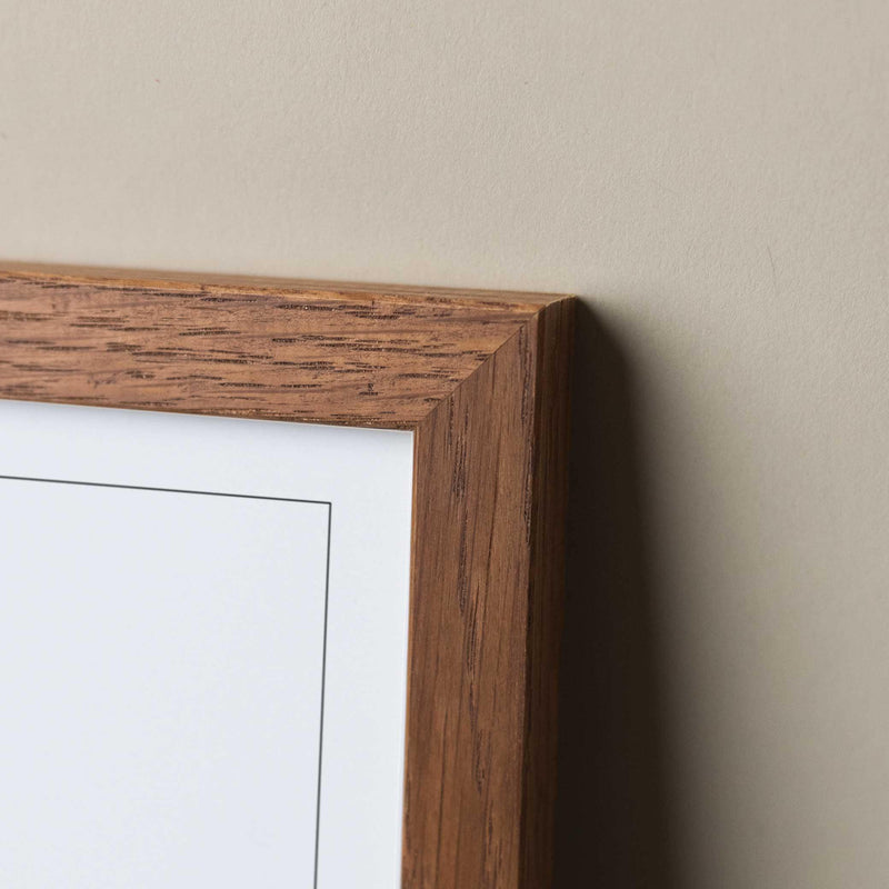 Our modern frame is made of genuine oak and features real glass. The popular oak frame has been stained here, giving it a golden brown color. The wood type has been popular for decades because it fits well in all homes and rooms. The frame is designed to suit today's design trends. We have made the edge narrow so that the art prints are the focus when the frame hangs on the wall.