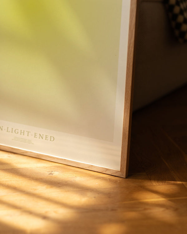 Our frames are made from high-quality materials and are available in solid oak, dark-stained oak, and black-painted pine. All frames come with real glass, while the largest sizes (70 × 100 cm and 100 × 140 cm) feature 2 mm acrylic glass, which looks like glass but is lighter and more shatter-resistant (durable).
