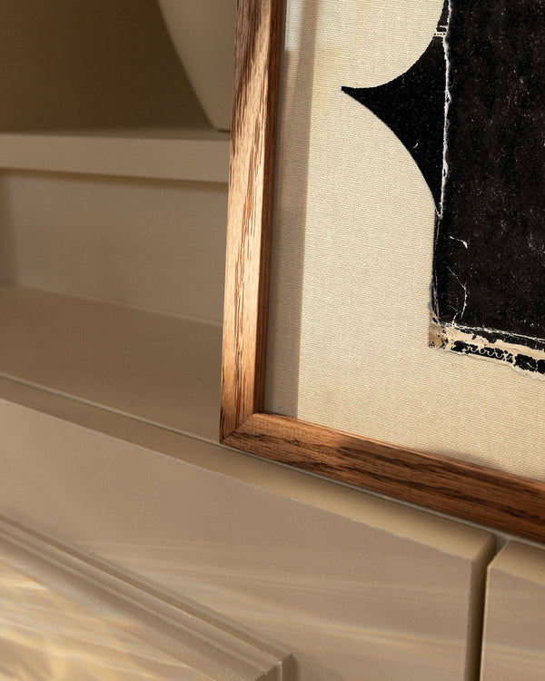 The Frames in oak are made of solid oak. The dark variant is stained to achieve a deep, warm tone, while the black Frame is made of black-painted pine with the same elegant profile.