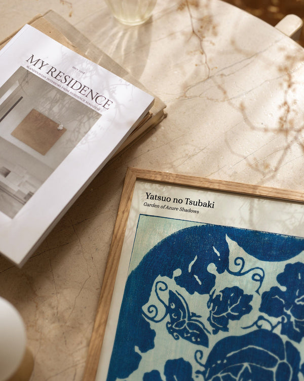The art print: "Garden of Azure Shadows" by the artist Taguchi Tomoki is a print, which Peléton has recreated from his woodcut collection "Yatsuo no tsubaki". This print series with Taguchi Tomoki's art prints is characterized by his colorful woodcuts. This print is part of Peleton's vintage collection with museum layout. The art print is produced on quality paper with long durability, high opacity, and detailed color reproduction.