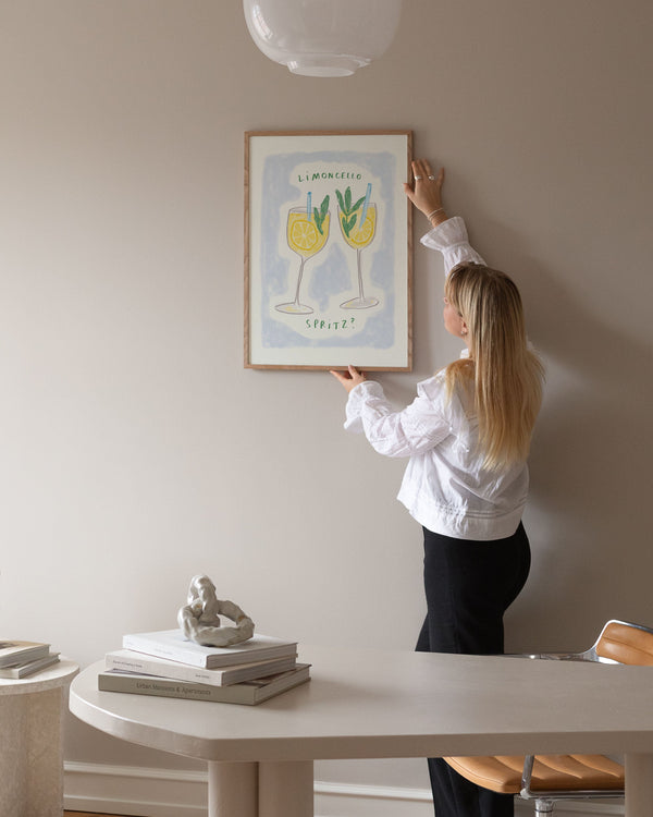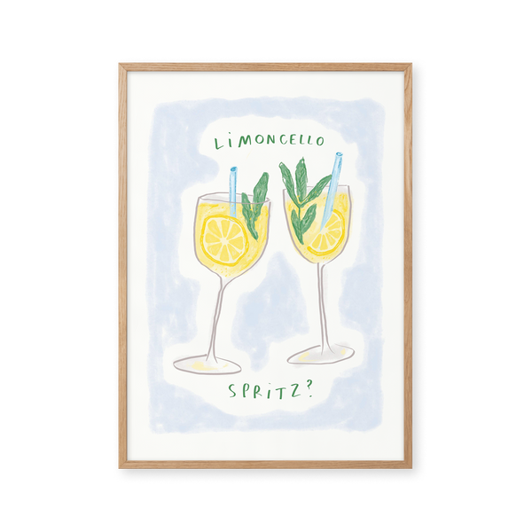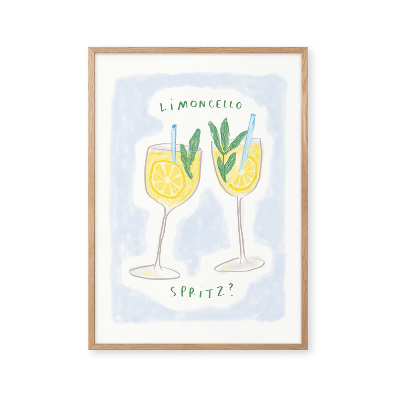 The art poster: “Limoncello Spritz” by the artist Lauren Emmett is an illustrated poster curated by Peléton. It has been meaningful to her that the poster is open to interpretation.