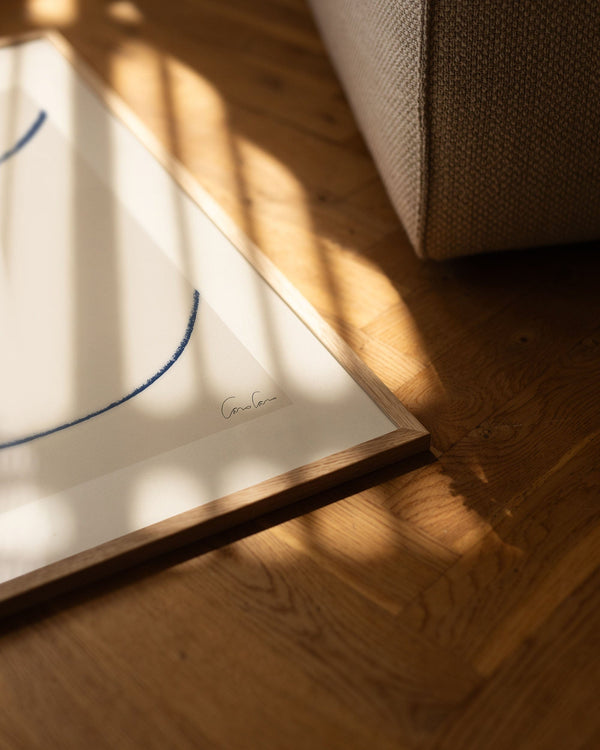 Our frames are made from high-quality materials and are available in solid oak, dark-stained oak, and black-painted pine. All frames come with real glass, while the largest sizes (70 × 100 cm and 100 × 140 cm) feature 2 mm acrylic glass, which looks like glass but is lighter and more shatter-resistant (durable).