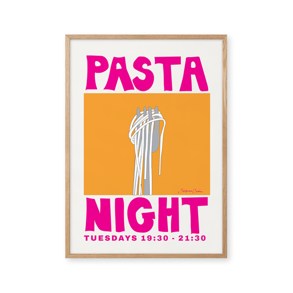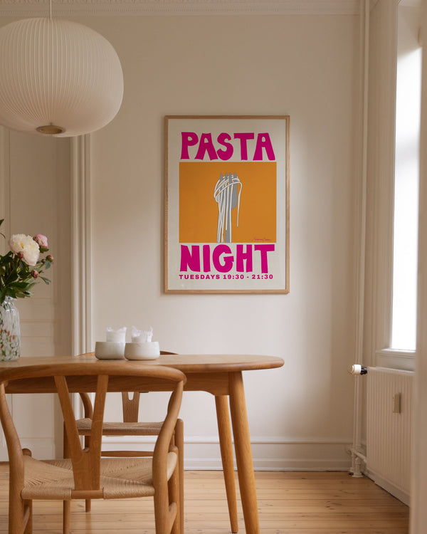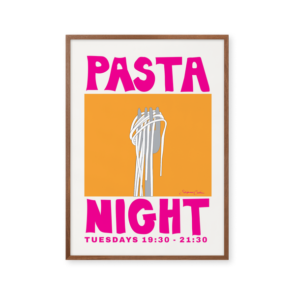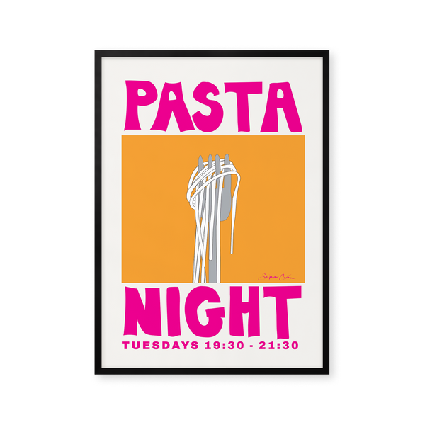 The art poster: “Pasta Night" by the artist Stephie Cardona is a graphically illustrated poster curated by Peléton. It has been meaningful to her that the poster is open to interpretation.