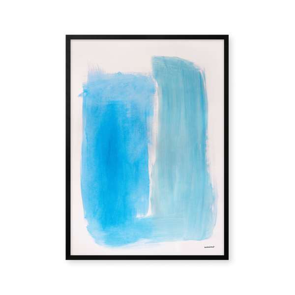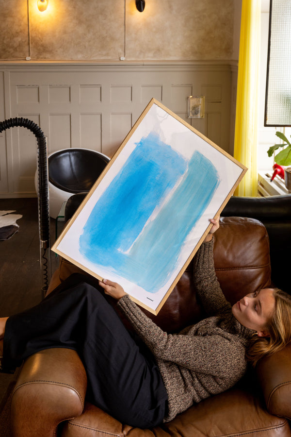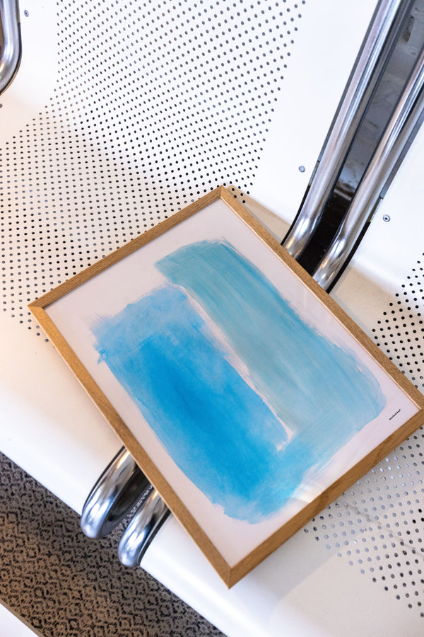 Kunstplakaten " Piscine" af Sara Stribrant er malet som en del af en større kollektion, hvor de blå nuancer indtager en central rolle. For Sara har det været afgørende, at værket står åbent for fortolkning.