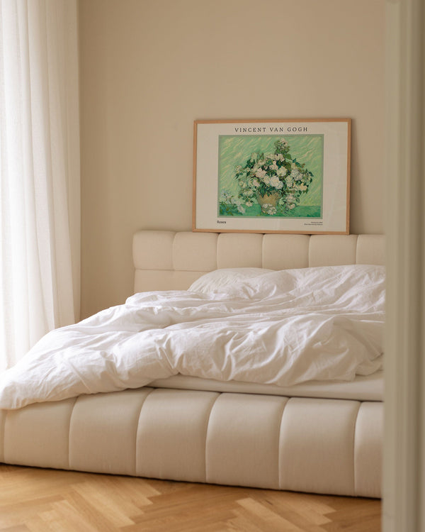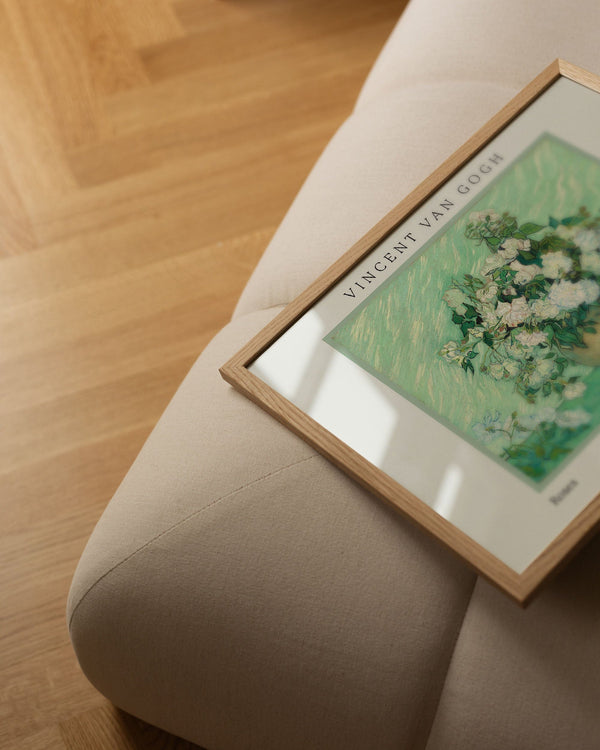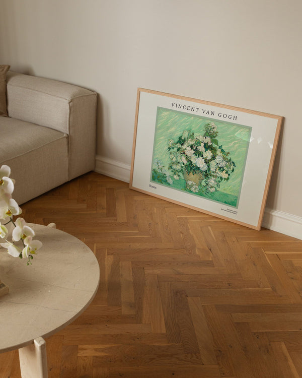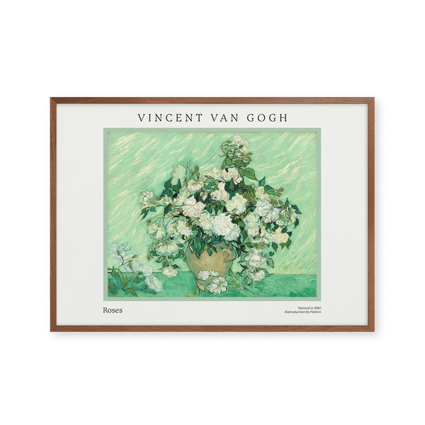 The art print: "Roses" by the artist Vincent van Gogh is a painted poster recreated by Peléton. This poster series with Vincent van Gogh's art prints is characterized by his artworks with strong colors and dramatic, impulsive, and expressive brushwork. This poster is part of Peleton's vintage collection with museum layout. The art print is produced on quality paper with long durability, high opacity, and detailed color reproduction.