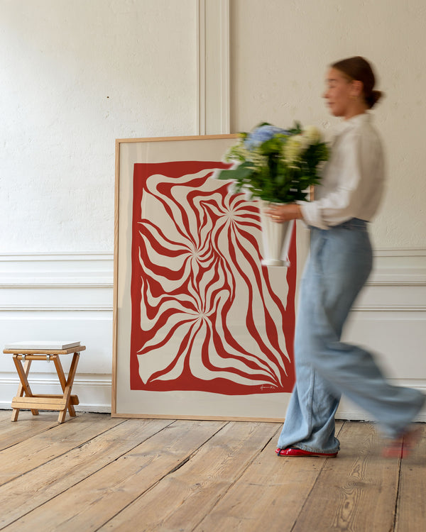 The art print: “Rush” by the artists Hanna KL is a graphically illustrated poster exclusively made for Peléton. It has been meaningful to them that the poster is open to interpretation. This work is part of a collection of exclusive art prints that express minimalism and simplicity.