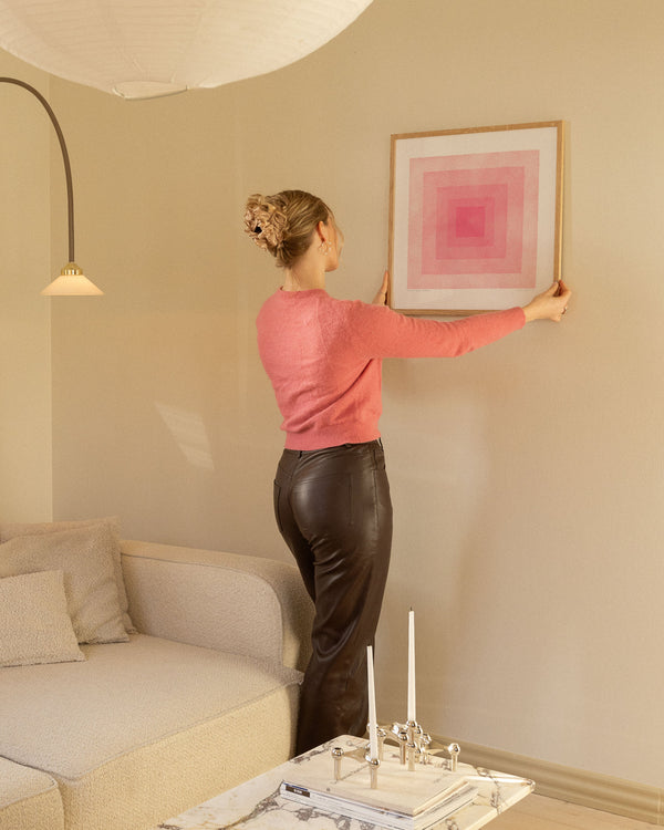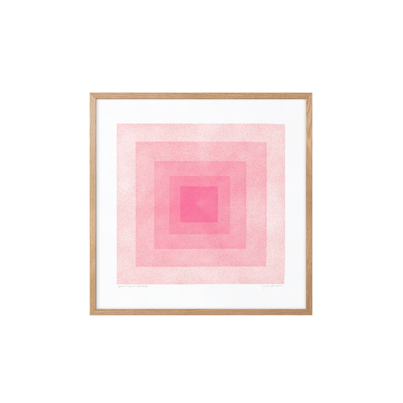 The art print: “Soft Geometry: Squares In Squares, Blush” by the artists Jessica Pundstone is a graphic illustrated poster, exclusively made for Peléton. It has been important to them that the poster is open to interpretation. This work is part of a collection of exclusive art prints that express minimalism and simplicity.