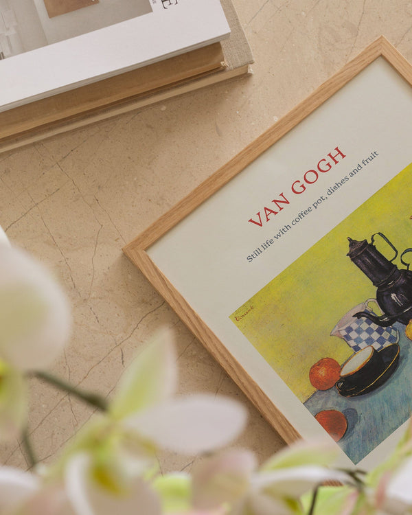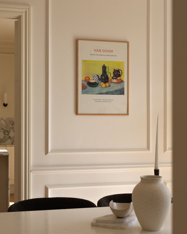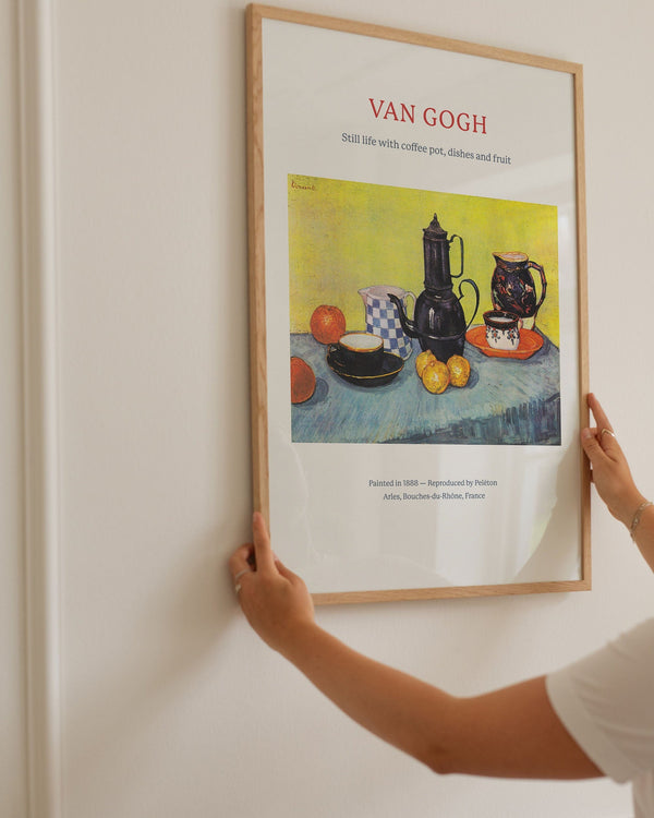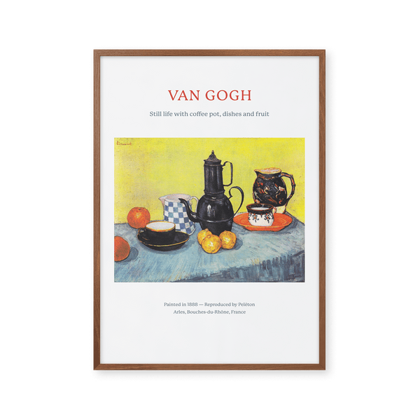 The art print: "Still life with coffee pot, dishes and fruit" by the artist Vincent van Gogh is a painted poster recreated by Peléton. This poster series with Vincent van Gogh's art prints is characterized by his artworks with strong colors and dramatic, impulsive, and expressive brushwork. This poster is part of Peleton's vintage collection with museum layout. The art print is produced on quality paper with long durability, high opacity, and detailed color reproduction.