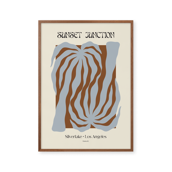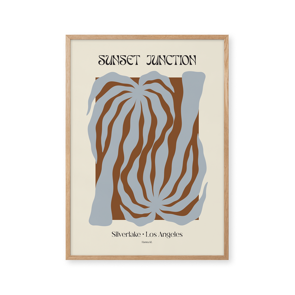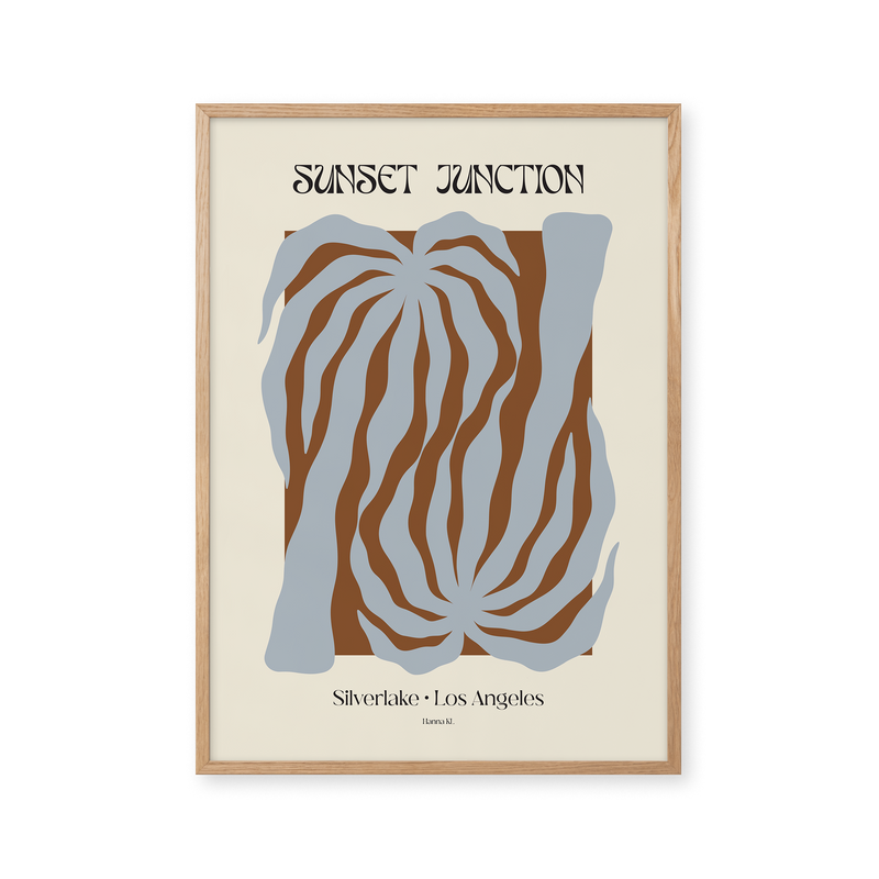 The art poster: “Sunset Junction” by the artist Hanna KL is a graphically illustrated poster curated by Peléton. It has been meaningful to her that the poster is open to interpretation.