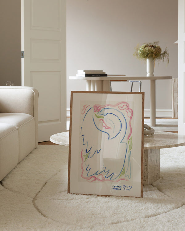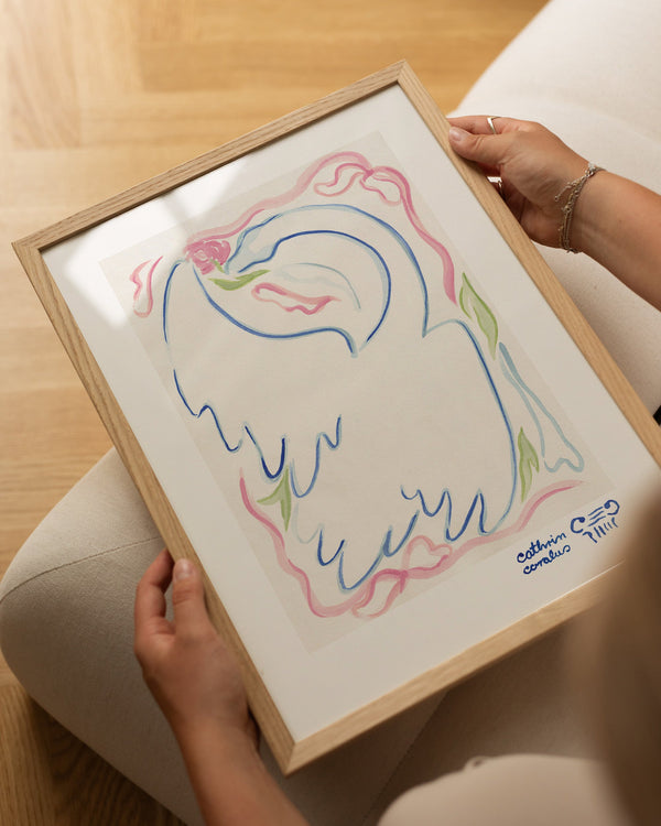 Cathrin Coralus kunstplakat "Swan" er en del af en farverig kollektion skabt eksklusivt til Peléton. Motiverne hylder legende kompositioner, stærke farver og Cathrins finurlige billedunivers, hvor sentimentale temaer og en kunstnerisk lethed går hånd i hånd.