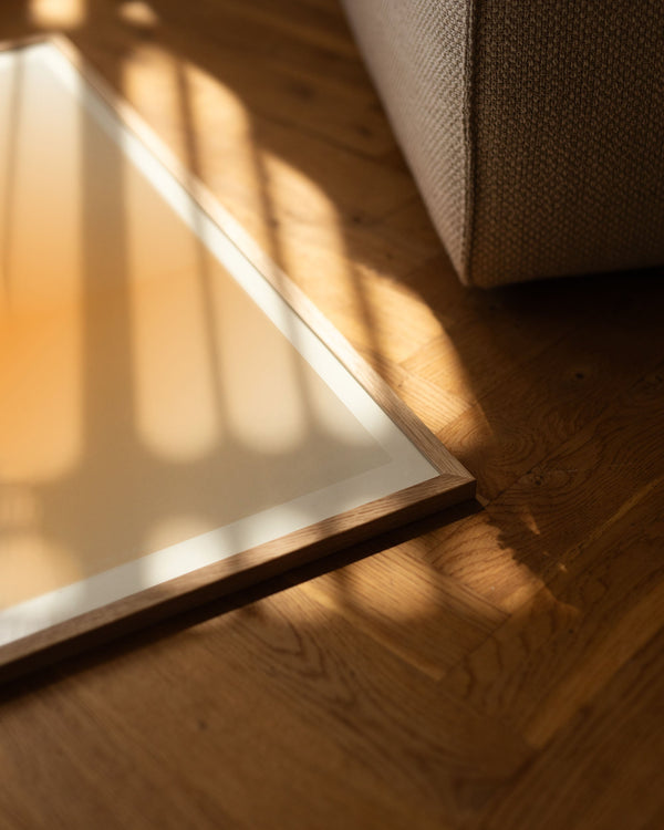 Our frames are made from high-quality materials and are available in solid oak, dark-stained oak, and black-painted pine. All frames come with real glass, while the largest sizes (70 × 100 cm and 100 × 140 cm) feature 2 mm acrylic glass, which looks like glass but is lighter and more shatter-resistant (durable).