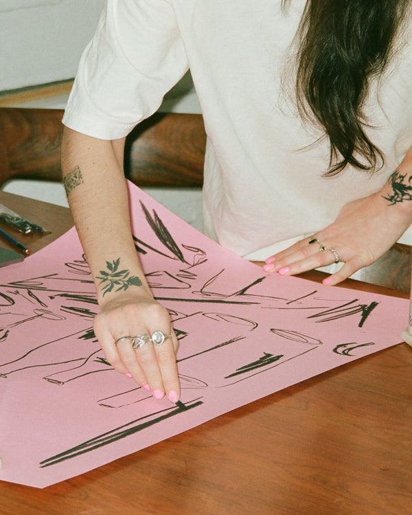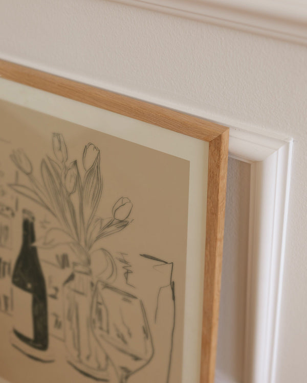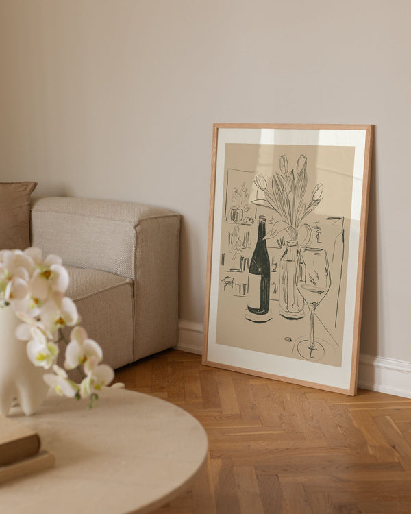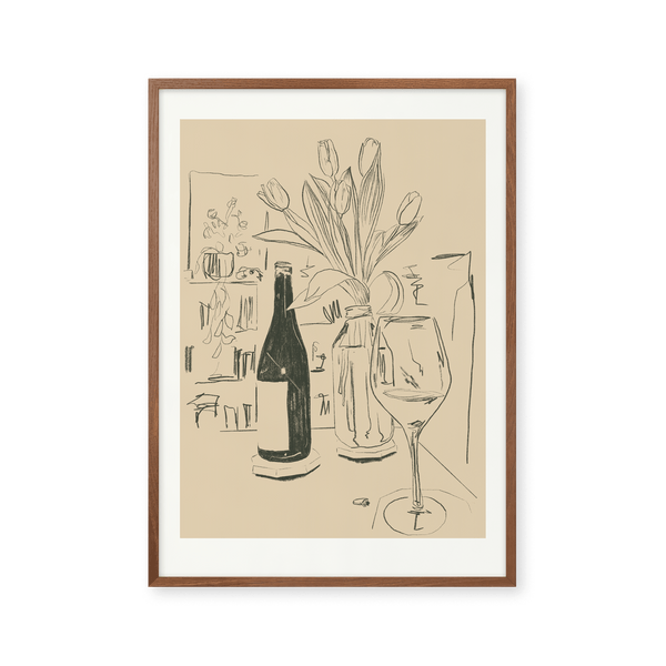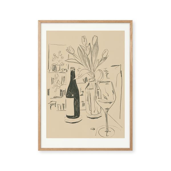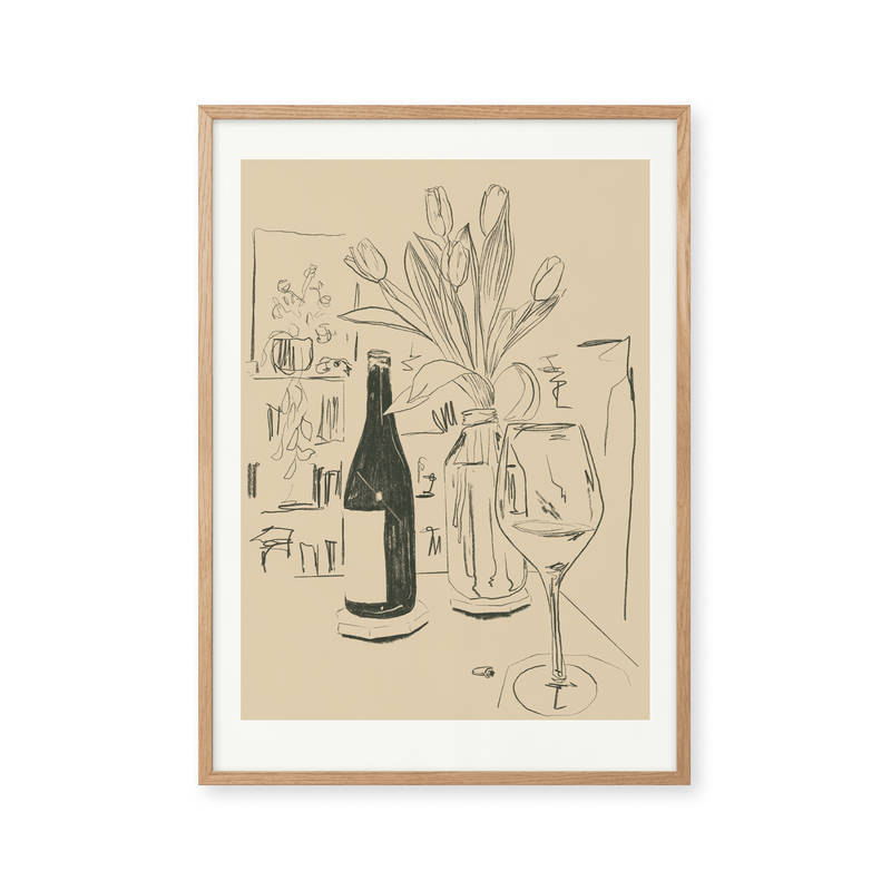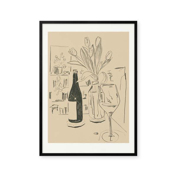 The art poster: "Tulips" by the artist Kiki Makes is an illustrated poster curated for Peléton. This work is inspired by a quiet evening at home. This still life work shows tulips, a glass of wine, and a bookshelf with plants in the background. This work was created digitally using minimalist colors and lines.