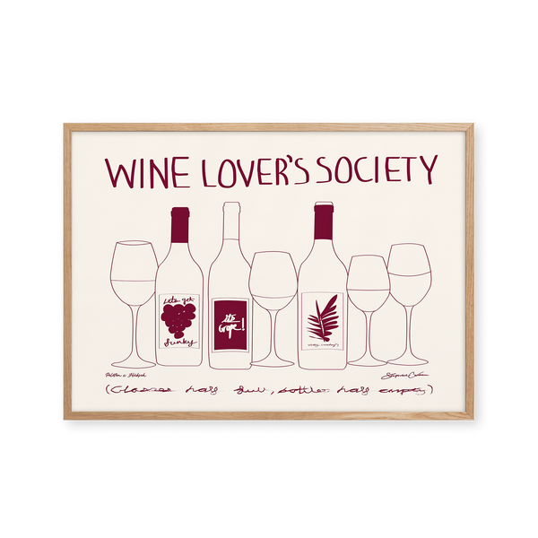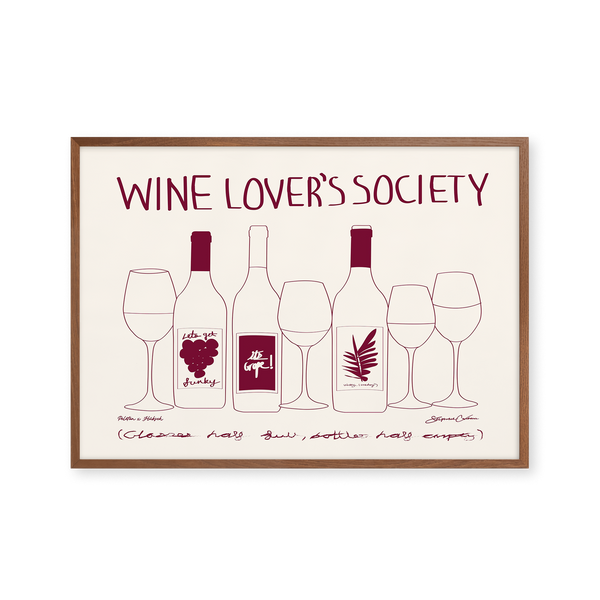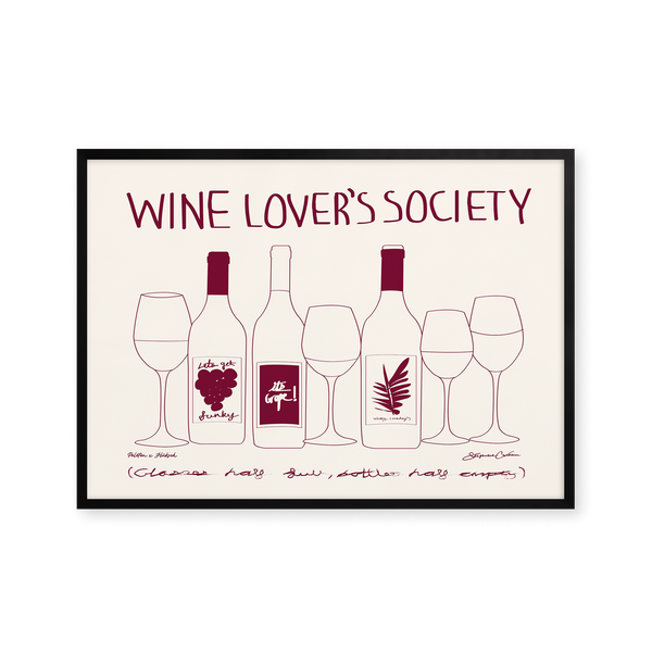 The art poster: "Wine Lover’s Society" by artist Stephie Cardona is a graphic illustrated poster exclusively made for Peléton, as part of the Hübsch x Peléton collection. It has been meaningful to her that the poster is open to interpretation.