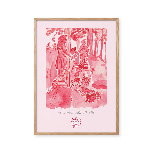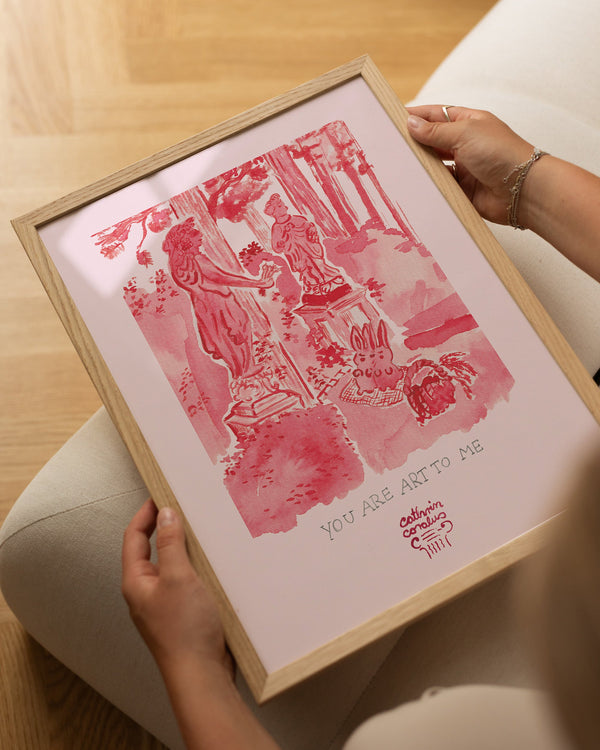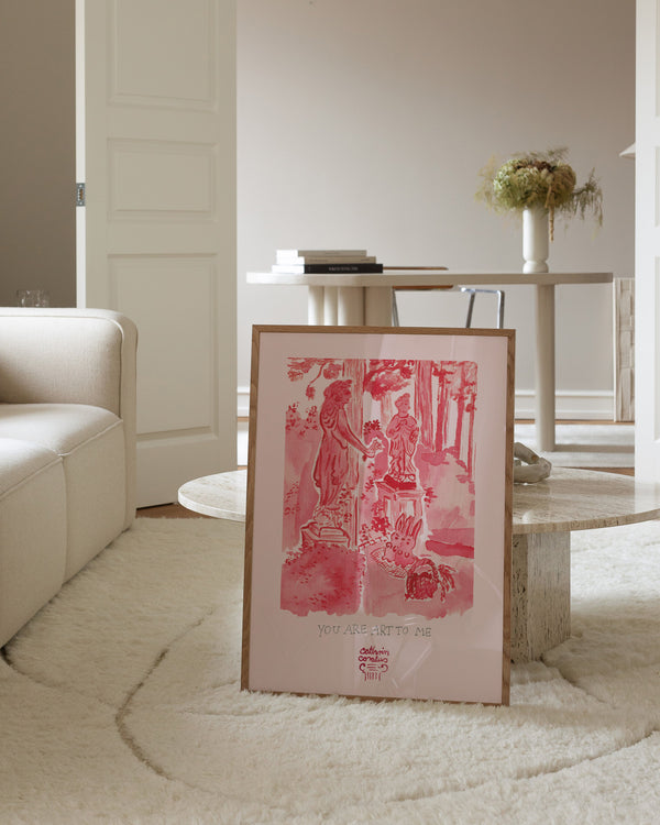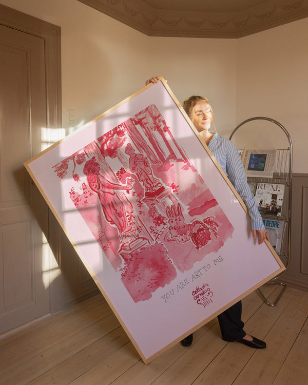 Cathrin Coralus kunstplakat "You are art to me" er en del af en farverig kollektion skabt eksklusivt til Peléton. Motiverne hylder legende kompositioner, stærke farver og Cathrins finurlige billedunivers, hvor sentimentale temaer og en kunstnerisk lethed går hånd i hånd.