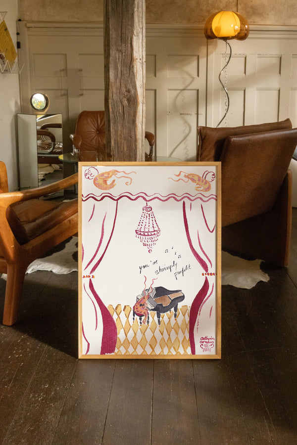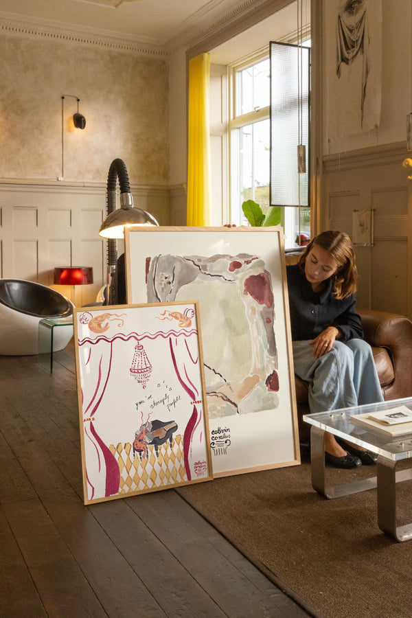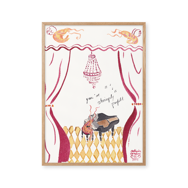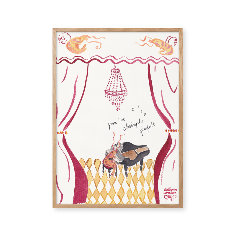 Cathrin Coralus kunstplakat "You’re shrimply perfect" er en del af en farverig kollektion skabt eksklusivt til Peléton. Motiverne hylder legende kompositioner, stærke farver og Cathrins finurlige billedunivers, hvor sentimentale temaer og en kunstnerisk lethed går hånd i hånd.
